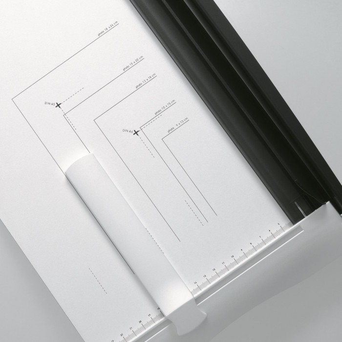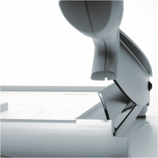 Urządzenie wyposażono w ręczny docisk papieru, przesuwny ogranicznik formatu oraz długość linii cięcia 430 mm, co umożliwia precyzyjne przycinanie nawet większych arkuszy.