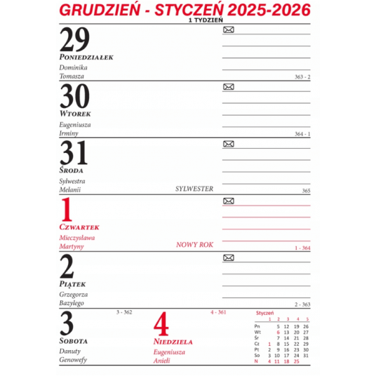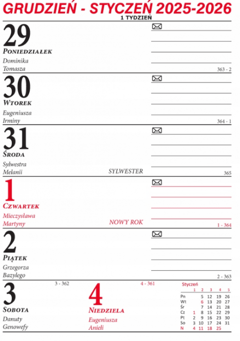 zawartość: pełny rok, imieniny, święta, numeracja tygodni