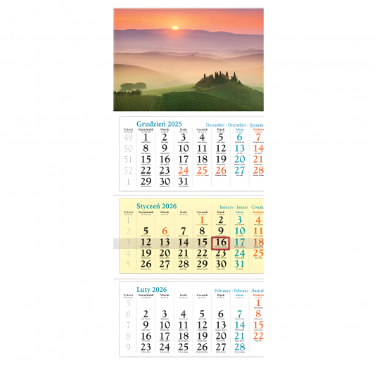 Kalendarz 2026 trójdzielny Toskania, Lucrum to klasyczny ścienny kalendarz trójdzielny z motywem pejzażu, który łączy funkcjonalność z eleganckim designem.