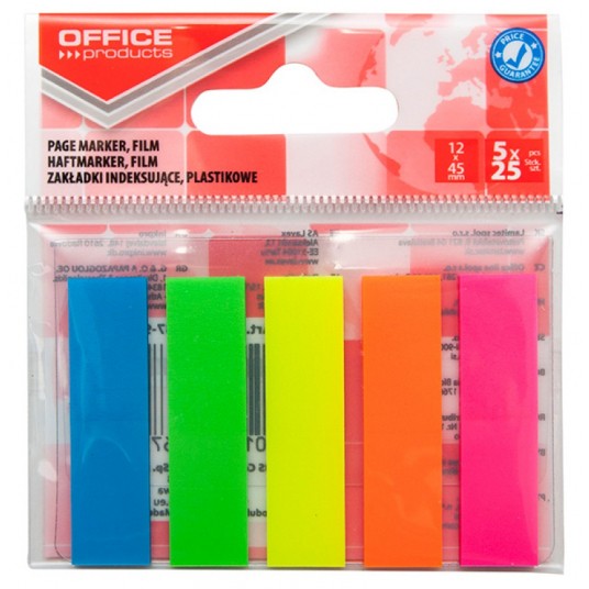 Zakładki indeksujące OFFICE PRODUCTS standard PP 12x45mm 5x25 kart. zawieszka mix kolorów