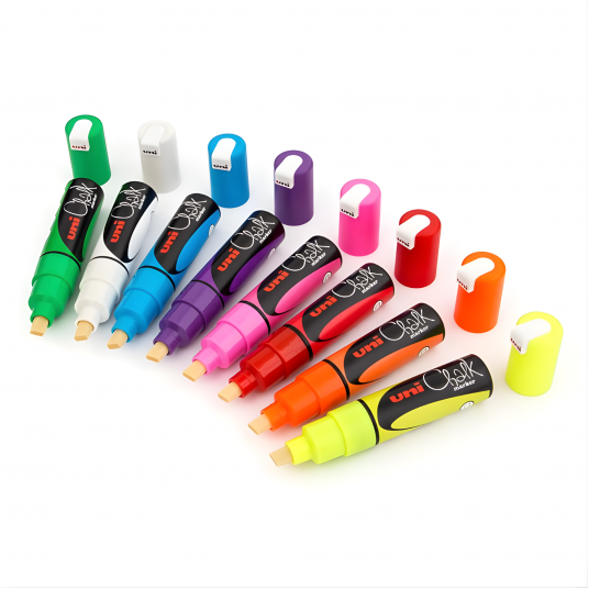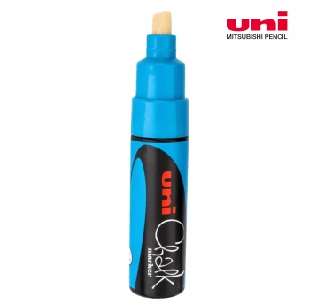 Marker kredowy Uni PWE-8K Chalk to profesjonalny marker z płynną kredą, przeznaczony do tworzenia wyraźnych i efektownych napisów na różnych powierzchniach.
