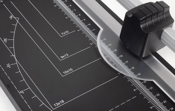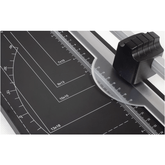 Na metalowej podstawie znajduje się podziałka milimetrowa oraz oznaczenia popularnych formatów, co ułatwia szybkie i dokładne ustawienie materiału przed cięciem.