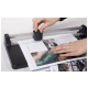 Dodatkowe atuty obejmują przezroczystą listwę docisku (zapewniającą stabilność arkusza podczas cięcia), antypoślizgowe stopki zwiększające bezpieczeństwo i komfort pracy oraz niewielkie wymiary i wagę, co pozwala na mobilne wykorzystanie lub łatwe przechowywanie.