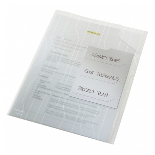 - mini organizer, posiada trzy przekładki, w których można posegregować dokumenty na spotkanie lub bieżące pliki - wymienne kartonowe etykiety do opisu zawartości - dokumenty nie wysuwają się dzięki narożnej, trójkątnej kieszeni, która zabezpiecza przed wypadaniem - grubość: 200 mic.