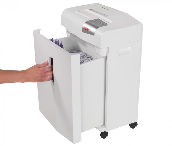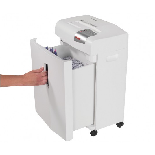 Kosz o pojemności 23 l ułatwia użytkowanie bez częstego opróżniania, a urządzenie wyposażone jest w funkcję automatycznego cofania (Reverse), zapobiegania zacięciom papieru oraz mobilne kółka, które ułatwiają przestawienie niszczarki w biurze.