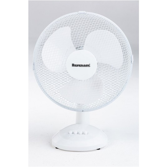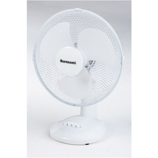 Wentylator biurkowy o średnicy 35 cm, mocy 40 W, z funkcją oscylacji, 3 prędkościami pracy, emaliowaną osłoną, pełną podstawą oraz z zabezpieczeniem przed przegrzaniem.
