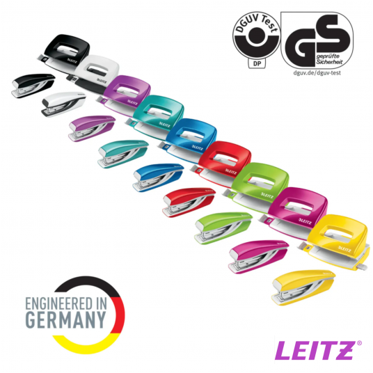 Poręczne, trwałe narzędzia do zszywania i dziurkowania dokumentów, dostępne w wielu kolorach.