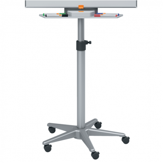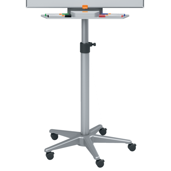 Przenośna podstawa z regulacją wysokości oraz kółkami z blokadą ułatwia przemieszczanie tablicy zgodnie z potrzebami.