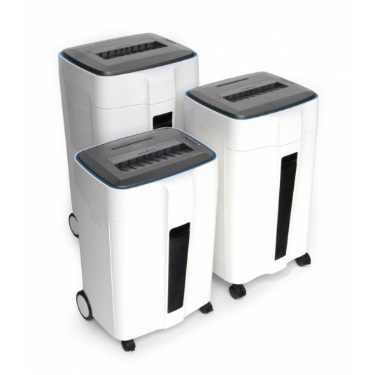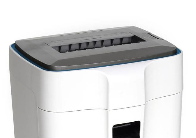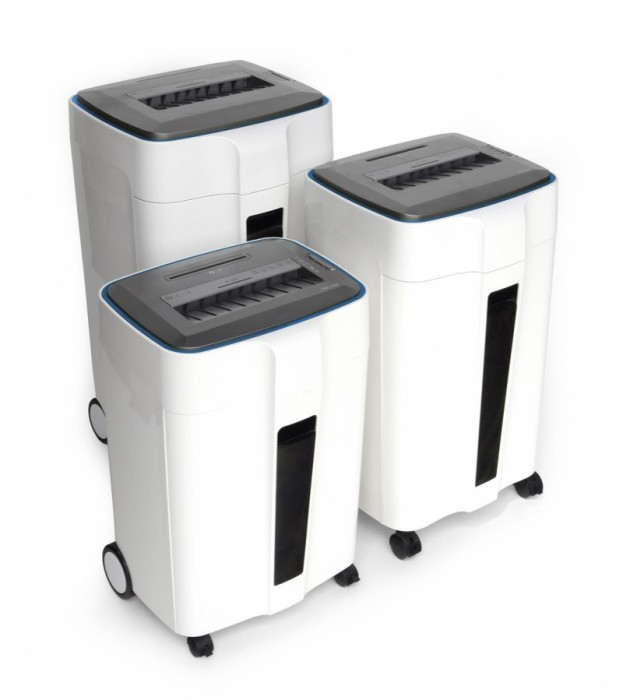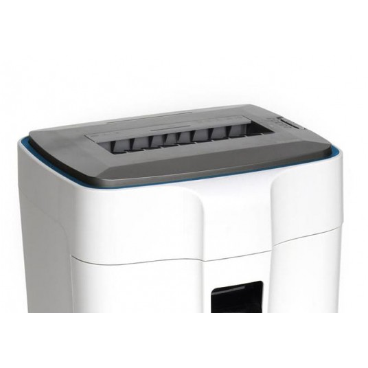 Niszczarka stoi na kółkach, co ułatwia jej przemieszczanie, i posiada wskaźnik optyczny napełnienia kosza oraz diodę alarmującą o otwartych drzwiczkach lub zapełnieniu.