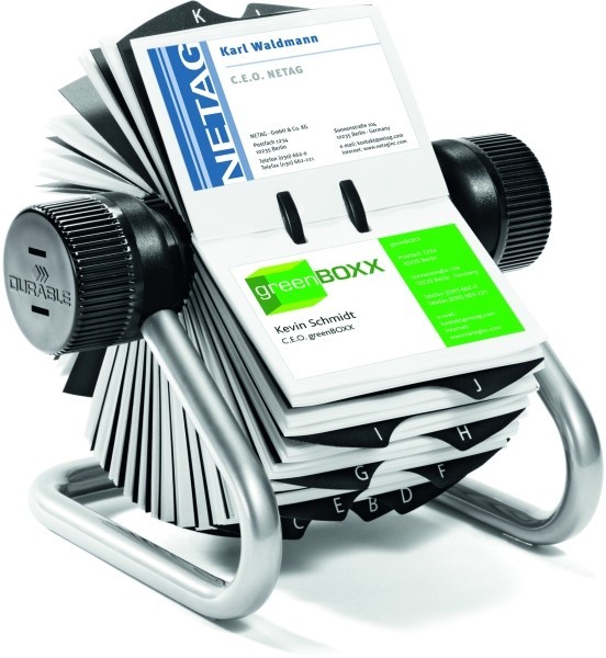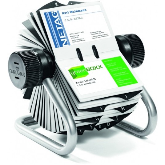 Wizytownik obrotowy na na 400 wizytówek. Z 200-stu kieszonkami w formacie 72 x 104 mm.. 25-cio częściowy rejestr, złożony z przekładek od A do Z. Dzięki specjalnemu mechanizmowi obrotowemu wygodny dostęp do wizytówek. Łatwe wyciąganie i wkładanie kieszonek na wizytówki.