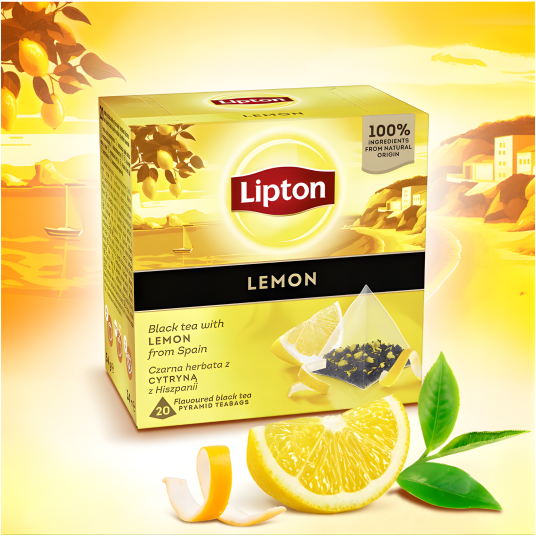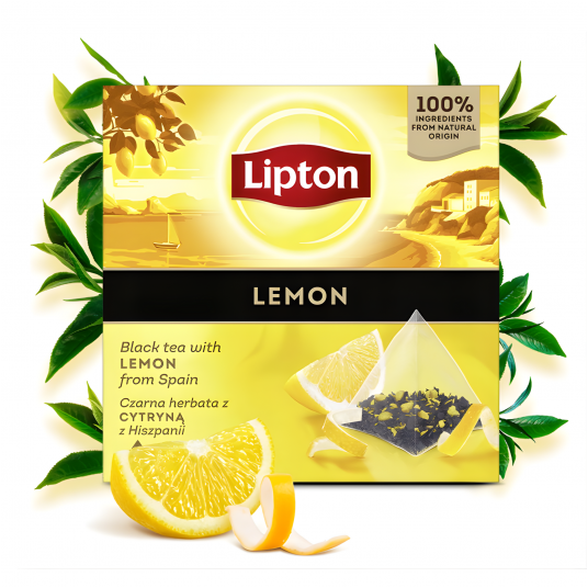 Herbata Lipton to klasyczna czarna herbata wzbogacona słodyczą skórki cytrynowej z owoców dojrzewających w słonecznej Hiszpanii, która łączy w sobie bogaty aromat, głęboki smak i wysoką jakość liści.