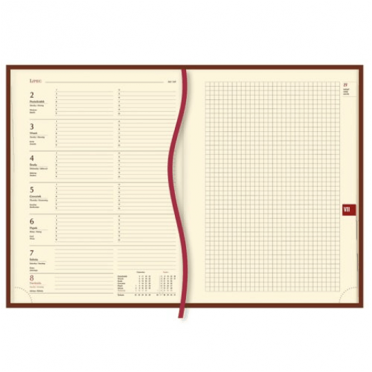 Układ tygodniowy, gdzie jeden tydzień zajmuje jedną stronę, a obok znajduje się dodatkowa strona dedykowana na notatki i priorytety. Lepszą organizację zapewnia druk kalendarium w 2 kolorach. Perforowane narożniki ułatwiają szybkie przechodzenie do aktualnego tygodnia, natomiast praktyczna tasiemka przydaje się do szybkiego oznaczania bieżącego dnia.
