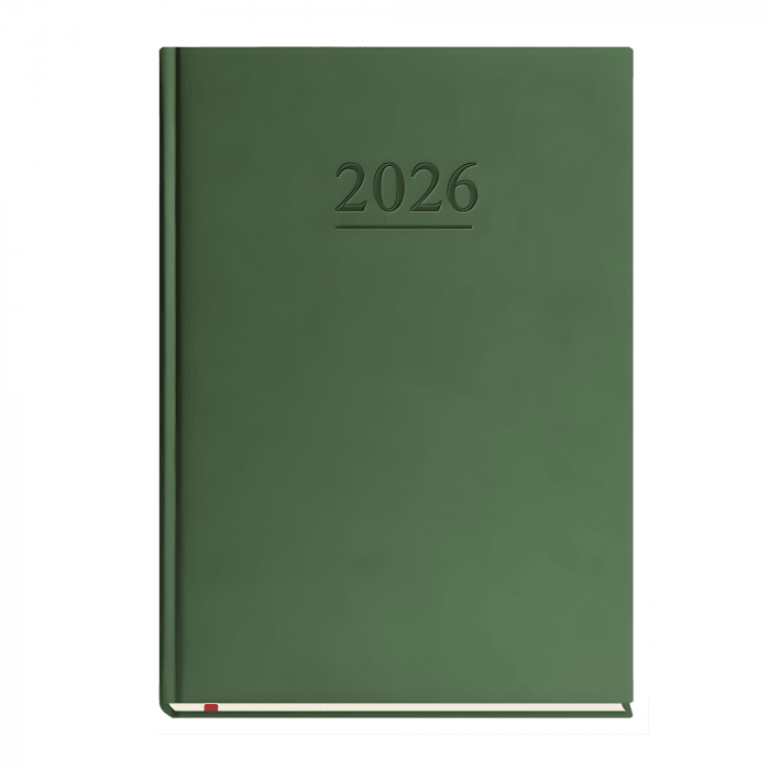 Elegancka i trwała oprawa skóropodobna w kolorze zielonym, kremowy papier i druk w dwóch kolorach zapewniają wysoki komfort użytkowania.