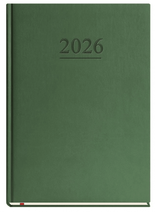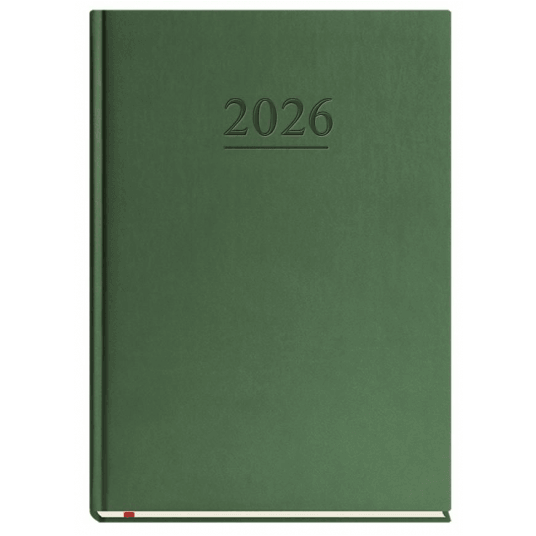 Elegancka i trwała oprawa skóropodobna w kolorze zielonym, kremowy papier i druk w dwóch kolorach zapewniają wysoki komfort użytkowania.