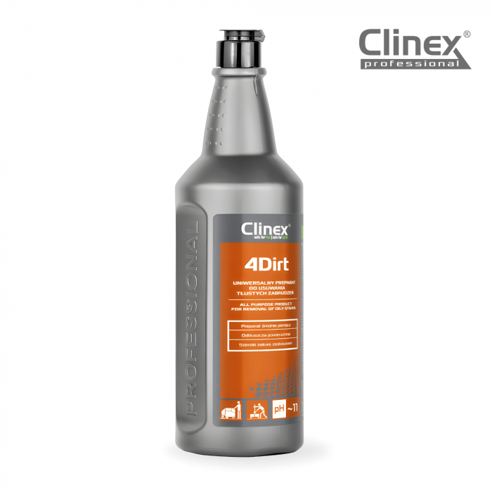 Preparat CLINEX 4Dirt 1 l to profesjonalny środek przeznaczony do skutecznego usuwania tłustych i uporczywych zabrudzeń z różnych powierzchni użytkowych.