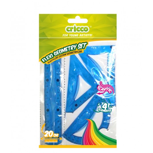 - elastyczny, wyginający się materiał odporny na złamania - precyzyjna, nieścieralna skala w cm i calach - cztery elementy składowe: linijka, ekierka 60°, ekierka 45° i kątomierz 180° - dokładne, nieścieralne podziałki w cm i w calach - pakowane w woreczek foliowy z zawieszką