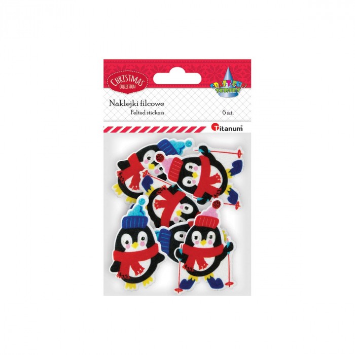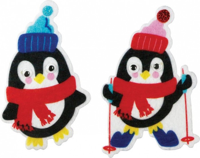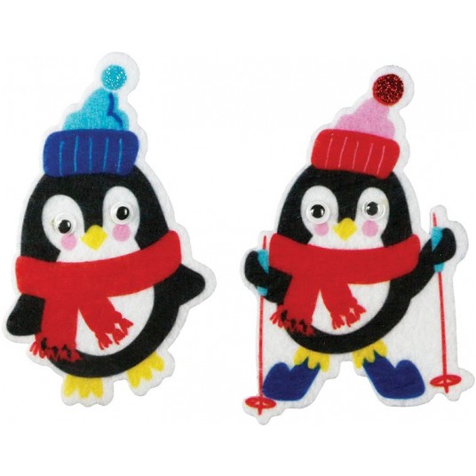 Naklejki filcowe. Kształty: pingwiny 48 x 79 mm, pingwiny na nartach 50 x 81 mm, ruchome oczy. 6 sztuk.
