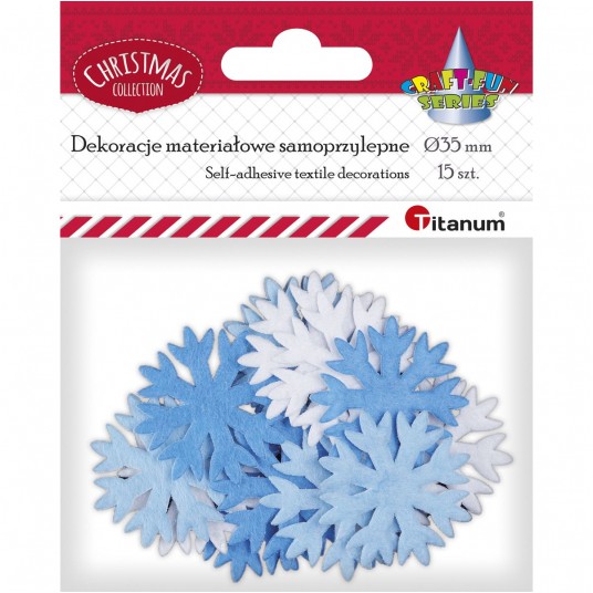Dekoracje materiałowe samoprzylepne. Kształt: płatki śniegu. Wymiary: 35 35 mm. Kolory: biały, błękitny, niebieski. 15 sztuk.