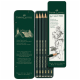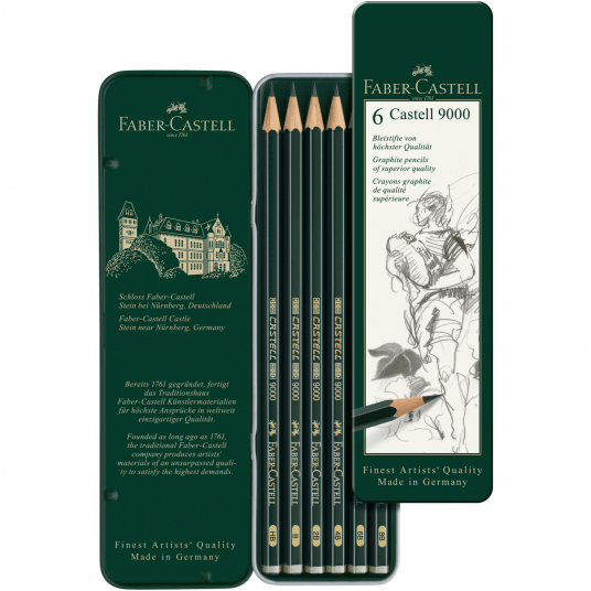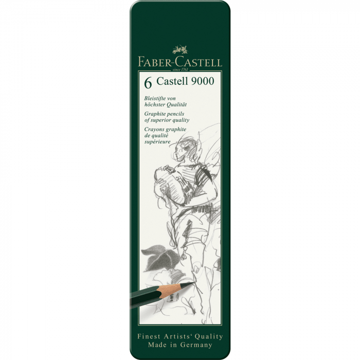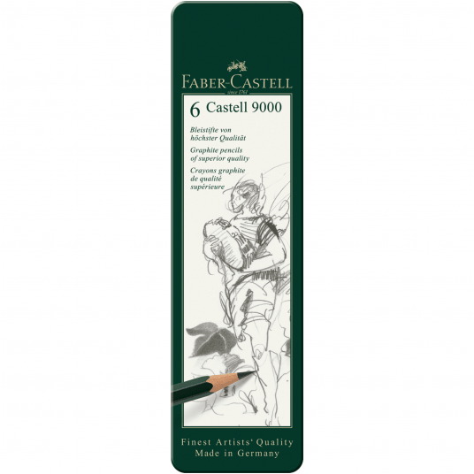 Zestaw ołówków grafitowych Castell 9000 Faber-Castell 6 szt. w kolorze zielonym. Kultowe i klasyczne – sześciokątne ołówki najwyższej jakości z wieloletnią tradycją. Wprowadzone na rynek przez hrabiego Alexandra von Faber-Castell w 1905 roku. Ich jakość i precyzyjnie stopniowane stopnie twardości sprawiły, że stały się ulubieńcem artystów i ilustratorów. Odpowiednie nie tylko do pisania, ale też szkicowania i rysowania. Z odpornym na pękanie grafitem o stopniu twardości HB, B, 2B, 4B, 6B i 8B, dzięki bezpiecznemu procesowi wiązania (SV). Wykonane z certyfikowanego, miękkiego drewna pochodzącego ze zrównoważonego i odpowiedzialnie zarządzanego leśnictwa. Powierzchnie pokryte lakierem na bazie wody – bezpiecznym dla środowiska i zdrowia. Dostępne w 16 różnych stopniach twardości, co czyni je idealnym ołówkiem do wszystkich zastosowań technicznych i artystycznych. Każdy ołówek jest opatrzony kodem kreskowym.