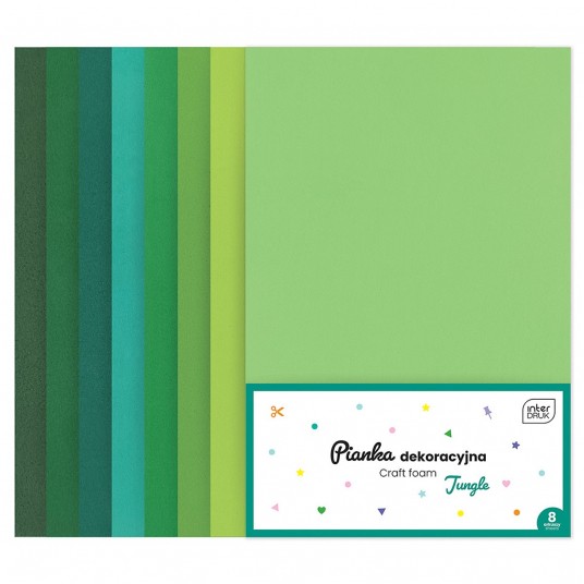 Zestaw 8 arkuszy pianki dekoracyjnej A4 z serii Jungle w intensywnych, żywych kolorach inspirowanych naturą. Idealna do prac plastycznych, dekoracji, scrapbookingu oraz projektów DIY.