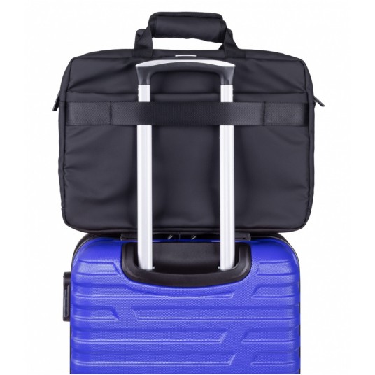 Torba wyposażona jest w pasek walizkowy, który pozwala bezpiecznie przymocować ją do uchwytu walizki lub wózka, co jest dużym plusem podczas podróży służbowych lub wyjazdów.