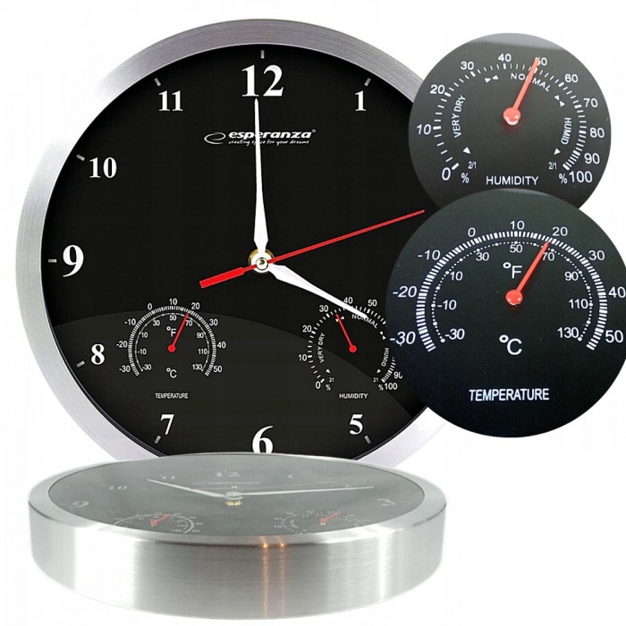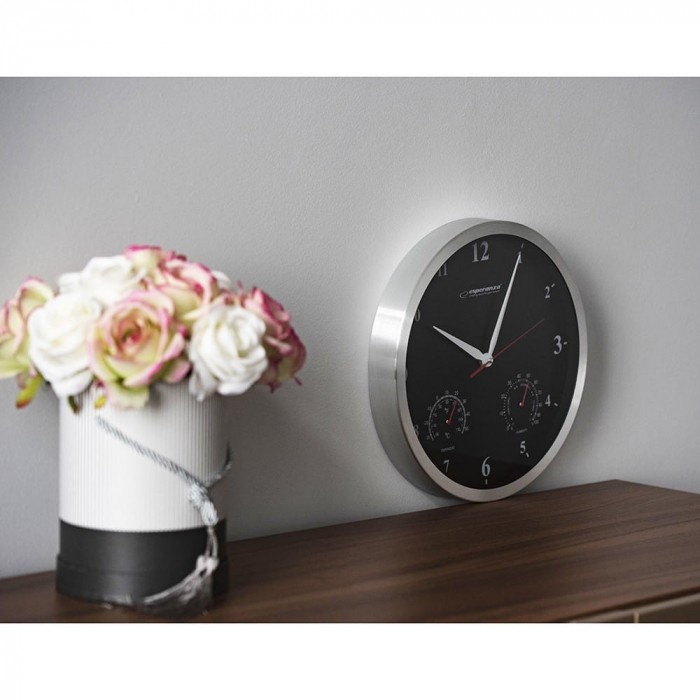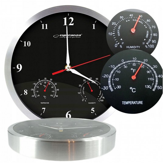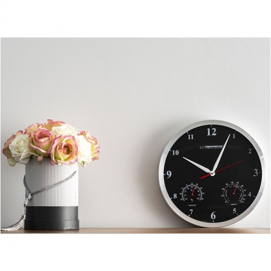 Zegar ścienny Esperanza Washington to stylowy, funkcjonalny czasomierz 3 w 1, który oprócz dokładnego pomiaru czasu pokazuje również temperaturę i wilgotność powietrza.