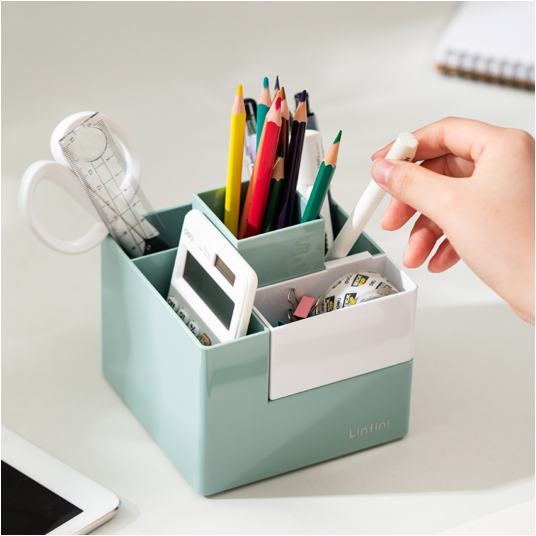 Dzięki przemyślanej konstrukcji z wieloma przegródkami umożliwia wygodne przechowywanie długopisów, ołówków, markerów, nożyczek, linijek oraz innych drobnych akcesoriów biurowych.