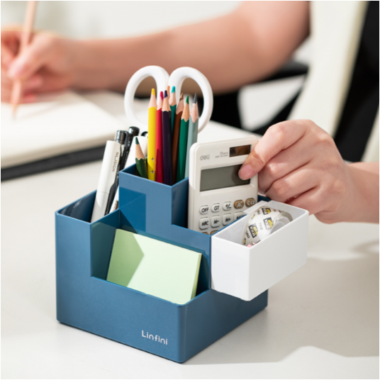 Dzięki przemyślanej konstrukcji z wieloma przegródkami umożliwia wygodne przechowywanie długopisów, ołówków, markerów, nożyczek, linijek oraz innych drobnych akcesoriów biurowych.
