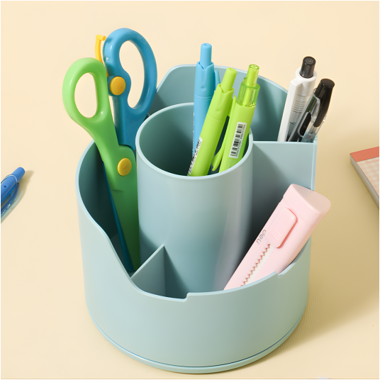 Dzięki obrotowej konstrukcji 360° możesz wygodnie sięgnąć po długopisy, ołówki, nożyczki czy inne przybory bez konieczności przesuwania organizera.