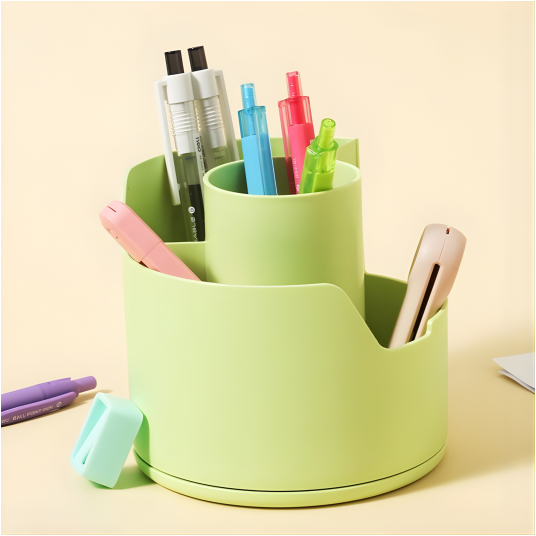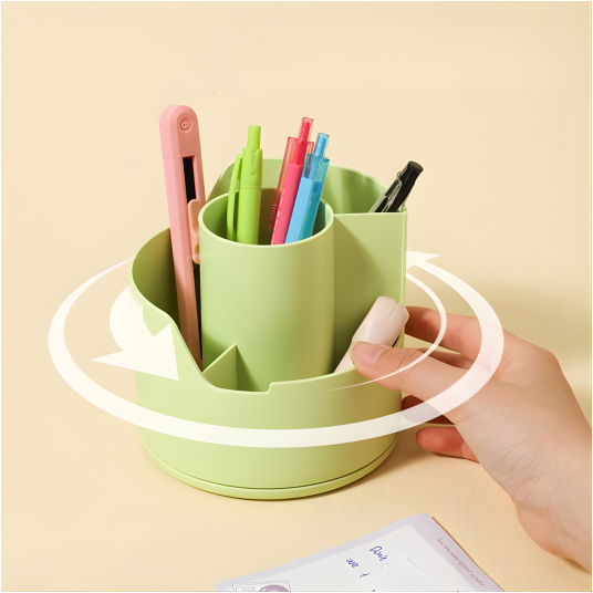 Dzięki obrotowej konstrukcji 360° możesz wygodnie sięgnąć po długopisy, ołówki, nożyczki czy inne przybory bez konieczności przesuwania organizera.