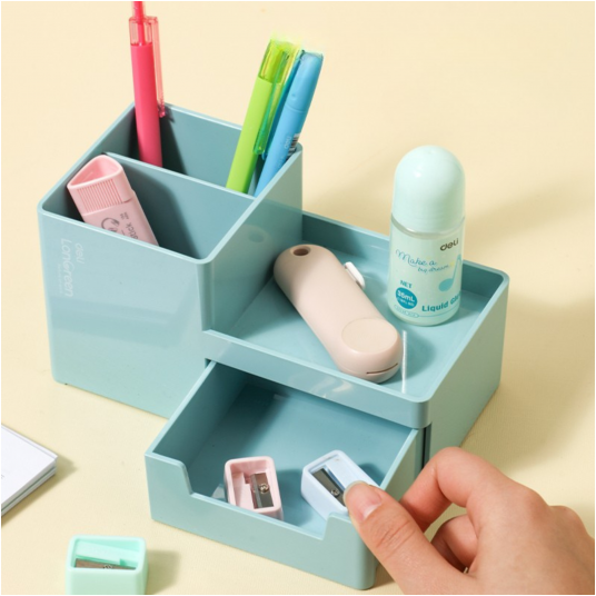 Nowoczesna konstrukcja z wysuwaną szufladą oraz oddzielnymi przegródkami umożliwia wygodne przechowywanie długopisów, ołówków, spinaczy, karteczek oraz innych akcesoriów biurowych.